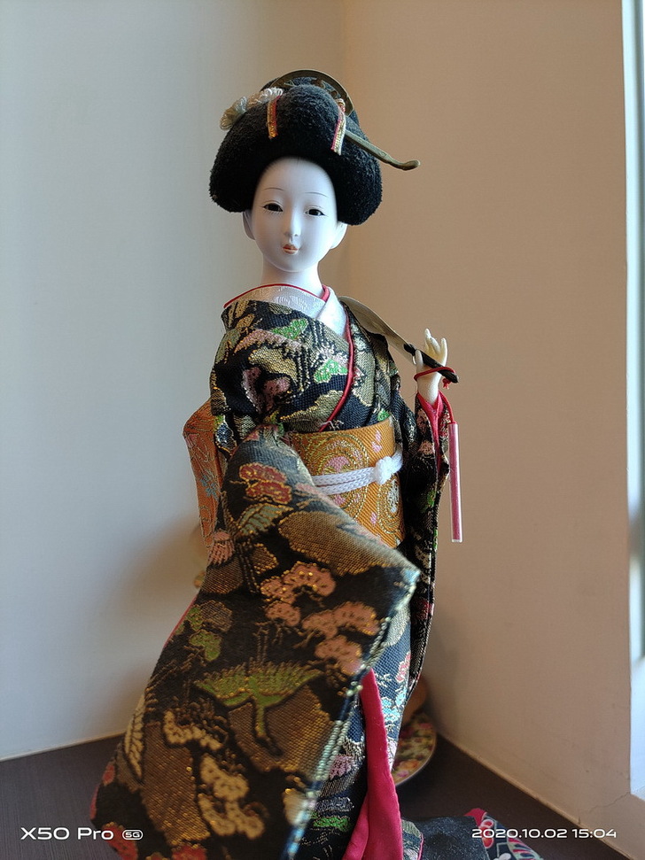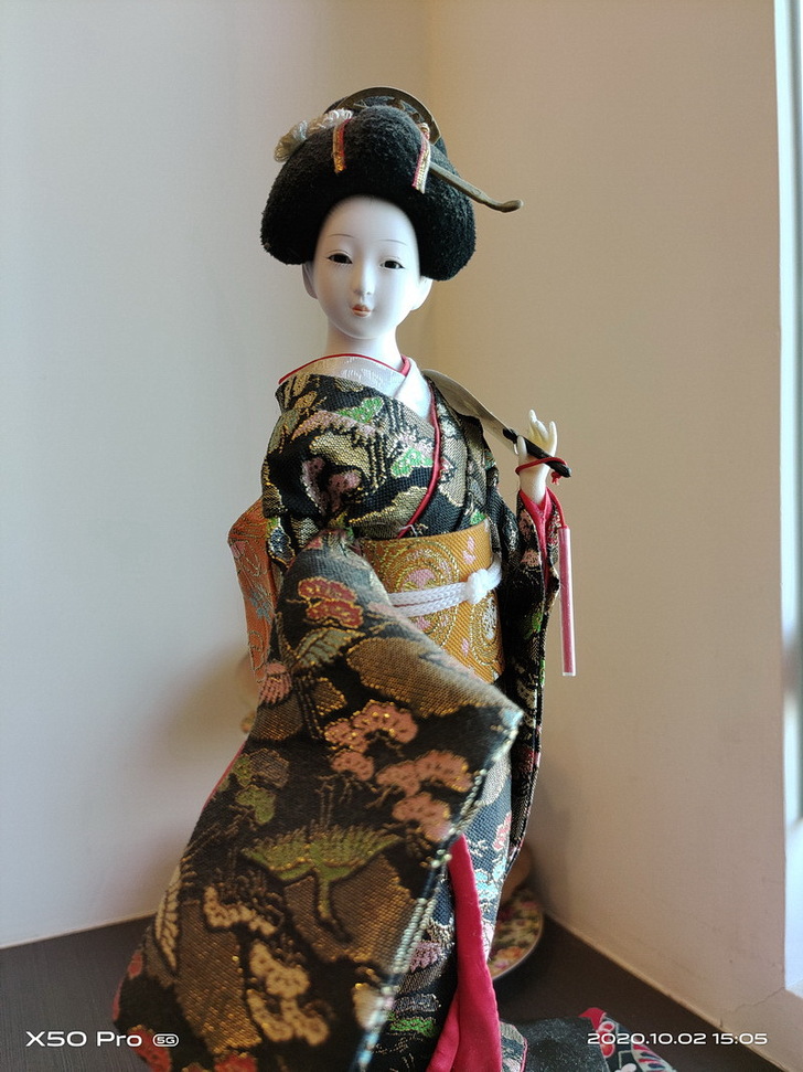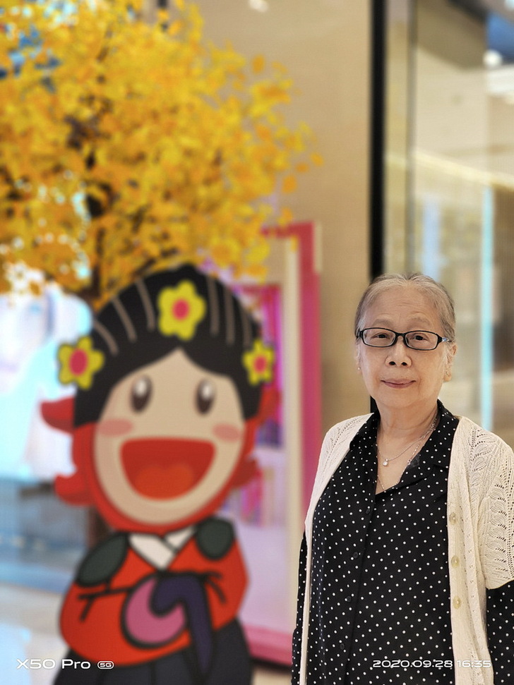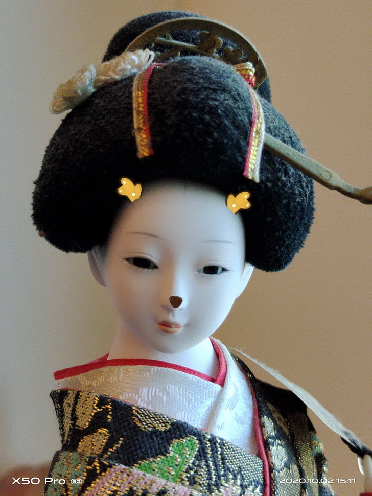 這個老媽抵死不拍,他說他真的不行,七老八十的人不適合裝萌,所以只好請出我的日本藝妓,vivo X50 Pro會自動偵測人臉,然後替你臉上加點萌。