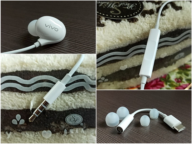 這年頭買手機還送有線耳機的廠商真不多了,這個有線耳機標明vivo商標,有個簡易的線控器,採用3.5mm 3節4環的插頭,因為vivo X50 Pro本身沒有3.5mm音源孔,所以還附上一個3.5mm轉USB C的轉接器,與兩組尺寸不同的矽膠耳機塞。