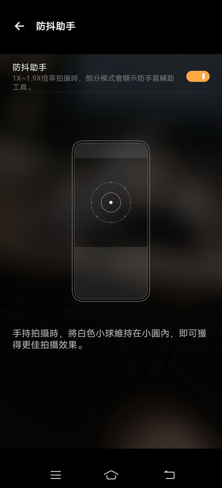 防抖助手實際開啟後。你會畫面中發現有兩個圓圈與一個圓點,雖然微雲台可以幫你減少手震,但也不是萬能的,你在拍攝的時候還是要小心,盡量控制讓圓點不要超過裡面比較小的圓圈,這樣微雲台控制手震的效果比較好。