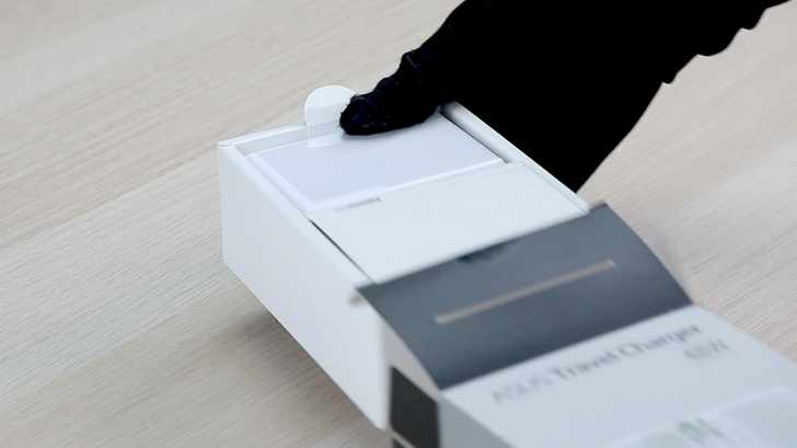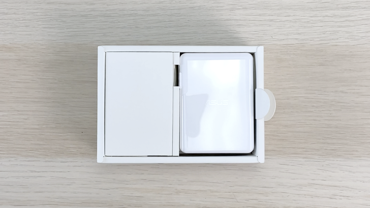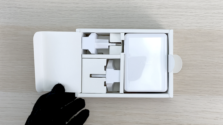 內盒抽屜的完整樣貌,左邊還特別多一層蓋子遮住底下的配件,右邊則是的潔白旅充本體。整個包裝和開箱過程都非常整齊、乾淨。
