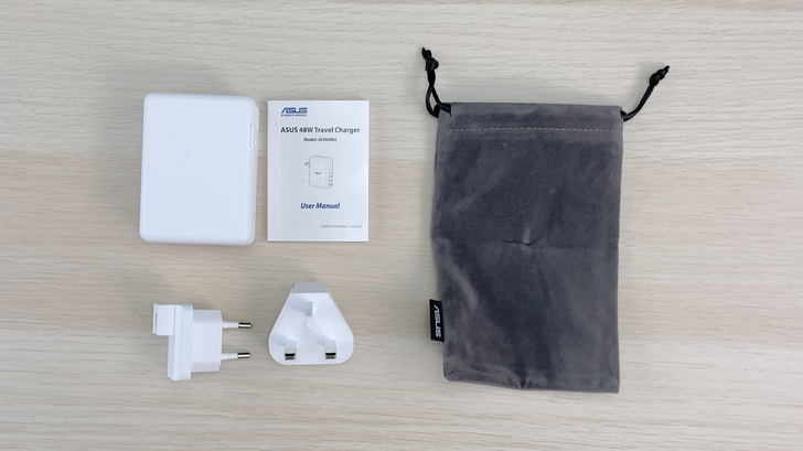 全部配件拿出後,排列合影一下。包括 48W 旅充本體、說明書、英規轉接頭、歐規轉接頭、絨布收納袋。