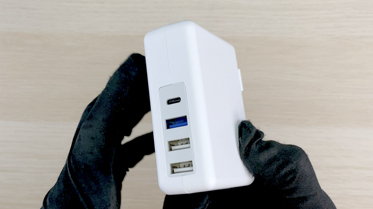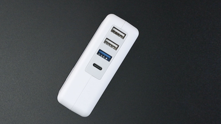 4 Port 48W 輸出,1C+3A 的設計。USB-C 可以支援到 30W 充電,剛好與目前 MacBook Air 原廠隨附的 30W 充電器相同,MacBook Pro 13 也可以充,只是速度慢,但一個晚上還是可以充飽。