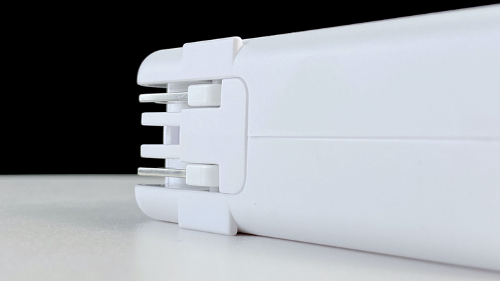 可折疊隱藏的插頭也是加分項目,讓收納和包裝時省心不少。中間的軌道可以讓轉接頭固定,中間有個小彈片,插入和拔出時會有明顯段落感,讓手指知道滑動的位置。
