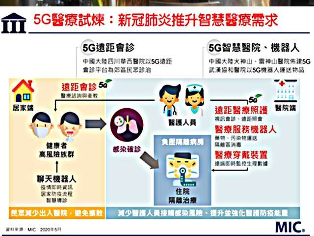 資策會產業情報研究所(MIC)指出,5G智慧醫療有六大潛力應用,包含:遠距生理監控、醫療物流機器人、AR手術導航系統、手持行動超音波、遠距醫療推車、數位五官鏡遠距診療,都是ICT業者廠可以切入的機會點。