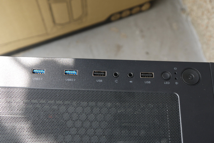 中間黑色的為USB 2.0、Azalia HD Audio音效插孔 分做耳機與麥克風,LED按鈕、以及Power按鈕