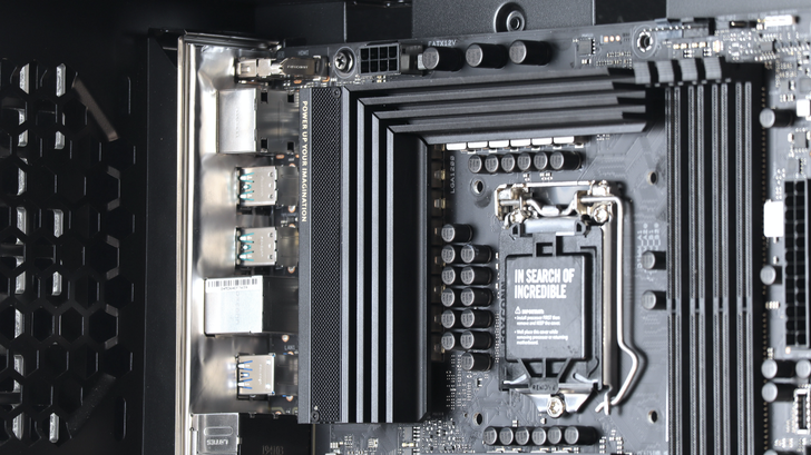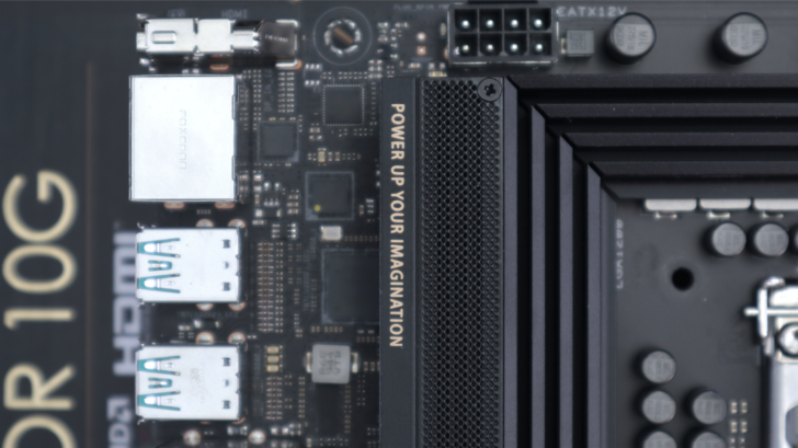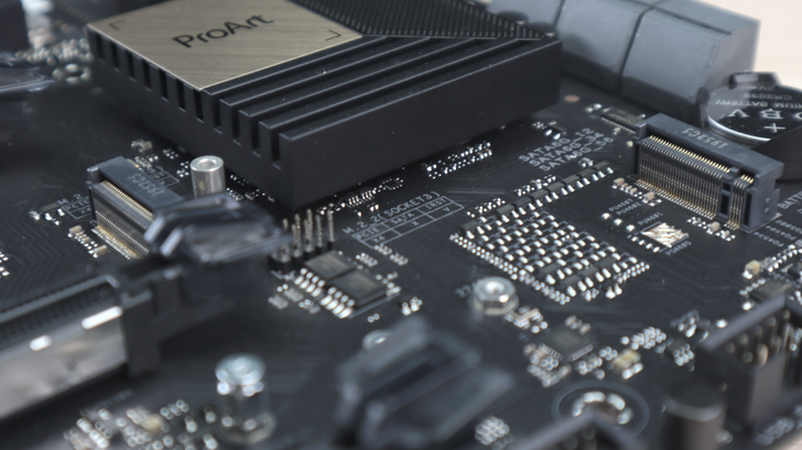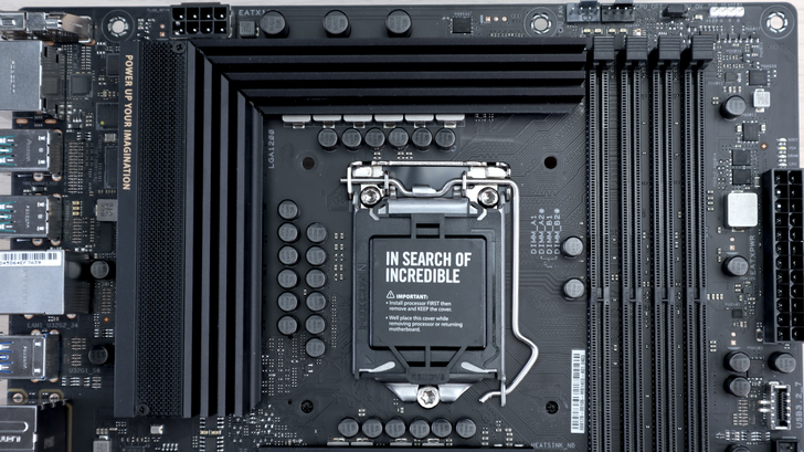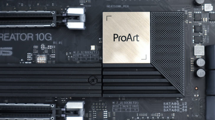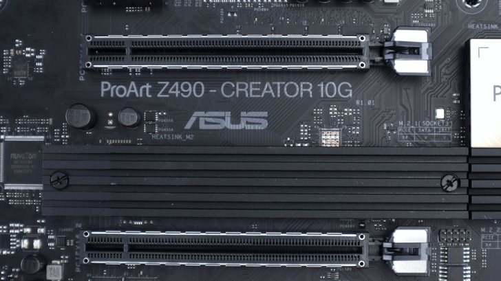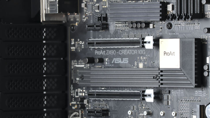 處理器 socket 周圍的供電區域,黑色的鋁擠型幫助散熱。不像電競主機板大量的斜紋設計,ProArt Z490 CREATOR 10G 線條設計直豎整齊,看起來就很療癒。