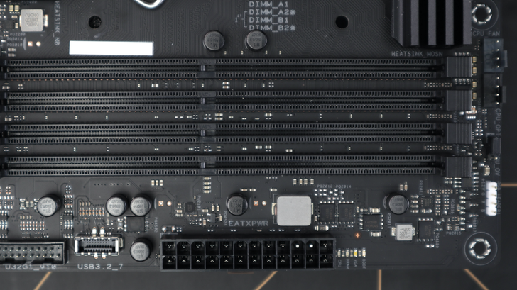 四條 DDR4 記憶體插槽,最高可支援 128GB。記憶體供電為一相,PWM 為茂達 Anpec 的 APW8723A 來控制,MOSFET 為 ON Semiconductor 的 4C10B。圖中左側有 CPU 風扇 header,還有 CPU_OV 的跳線,可以設定更高時脈的超頻。一旁白色的插座則是 12V RGB header,整張主機板有兩個 12V RGB 和一個 5V ARGB。前置 USB-C 和 USB-A,剛好對應到 InWin 905 這款機殼前置的 USB-A 和 USB-C,不過 USB-C 速度僅為 USB3.2 Gen1 5Gbps,前置非 10Gbps 的規格有點遺憾。