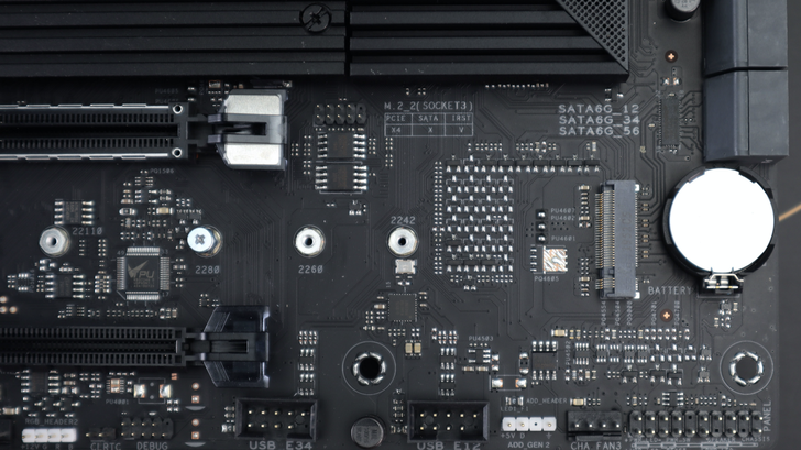 第二條的 M.2_2 不具備散熱片,可支援到最長 22110 規格。只支援 PCIe Gen3 x4,不支援 SATA。此 M.2_2 與 SATA5、SATA6 共用頻寬,需擇一使用,switch 在 M.2 與 SATA 之間。