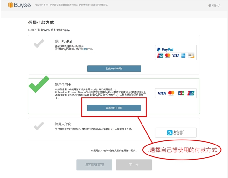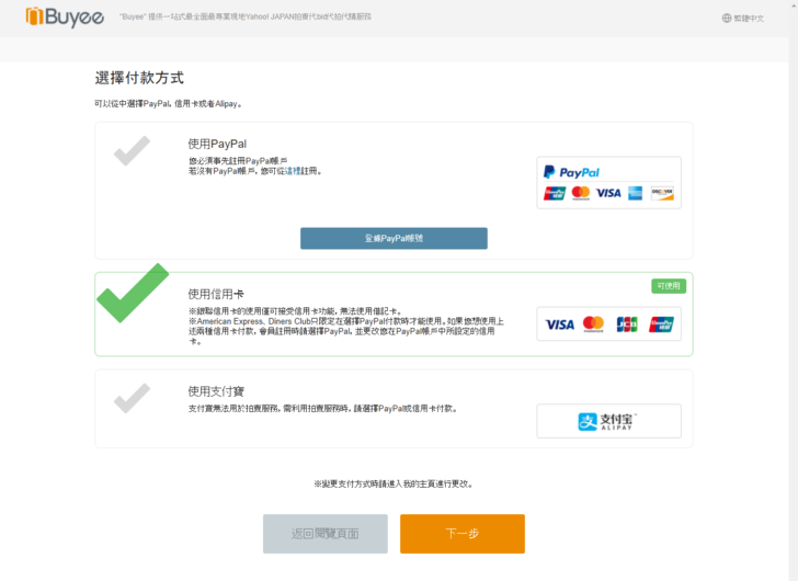 ▼填寫完成後,信用卡的選項會變成”可使用”,選擇信用卡,並按下一步。