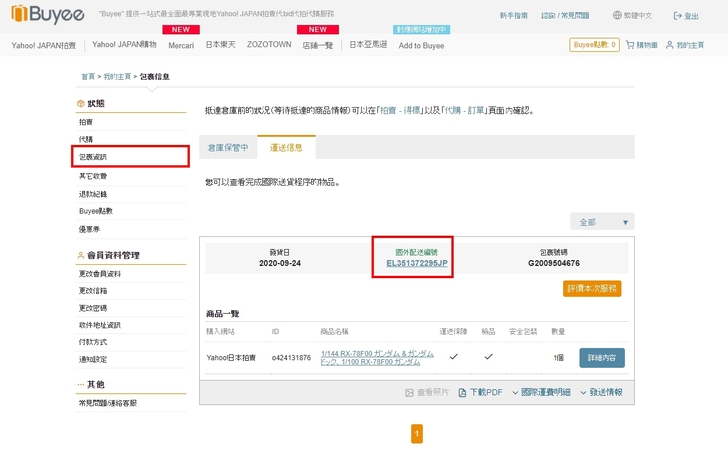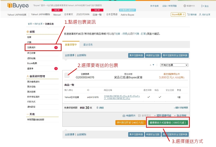 ▼幾天後(看賣家發貨及當地運送時間),可以看到包裹資訊的地方,有新的訊息,點進來一看,我訂購的商品已經到達Buyee的倉庫了,再來就是進入第二段付費,國際運費的介紹,在這裡選擇要寄送的包裹,並選擇運送方式。