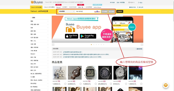 ▼小編接下來要使用的平台為日本雅虎拍賣,使用方式很簡單,就跟使用露天或蝦皮拍賣的方式一樣,在上方搜尋欄輸入想要尋找的商品(可使用中文)。