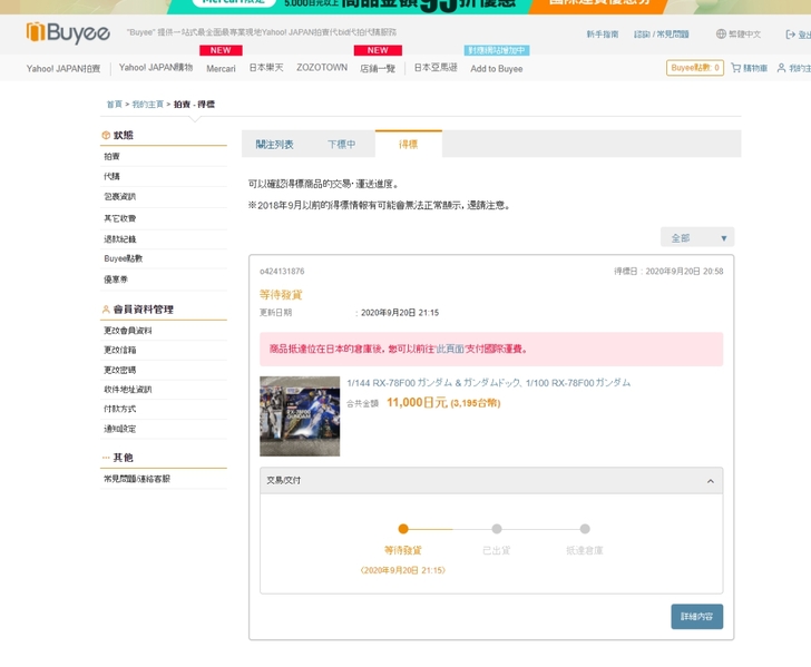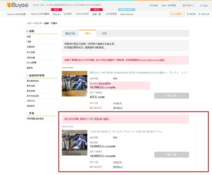 ▼確認得標後約十分鐘,就可以前往得標頁面查看得標的商品。