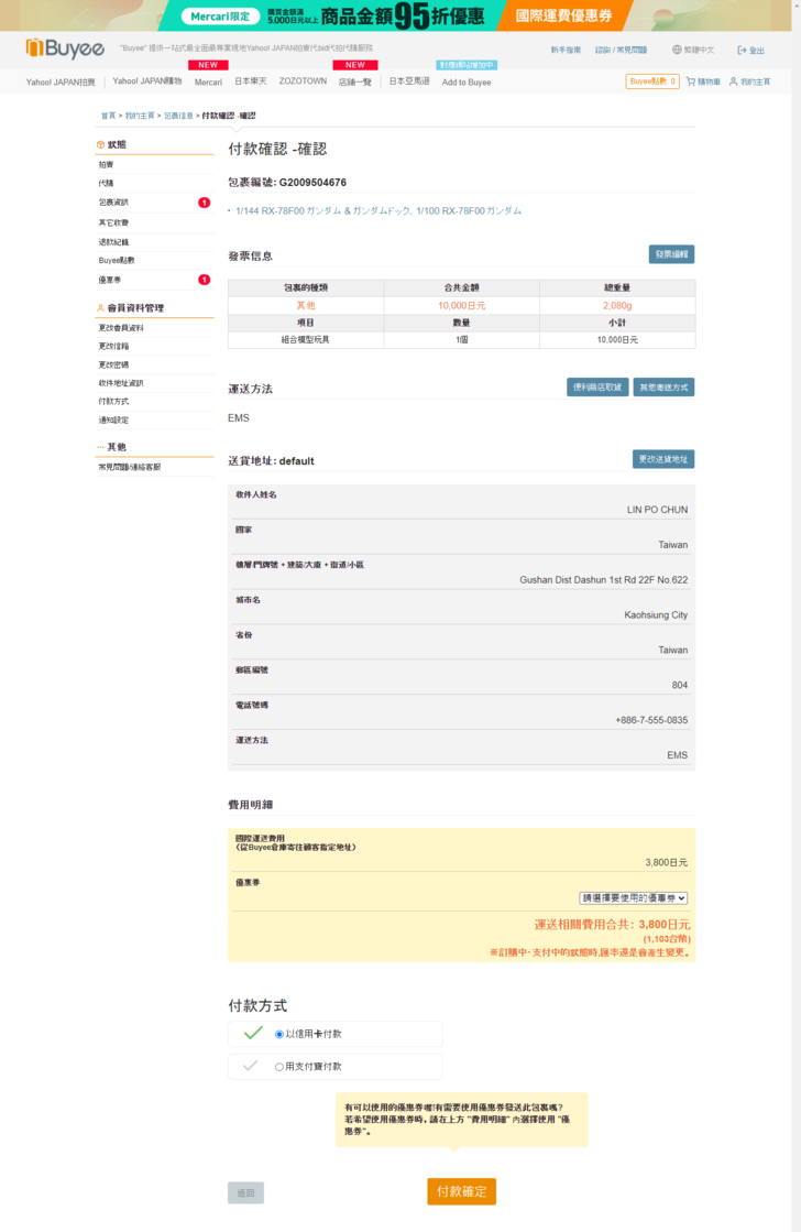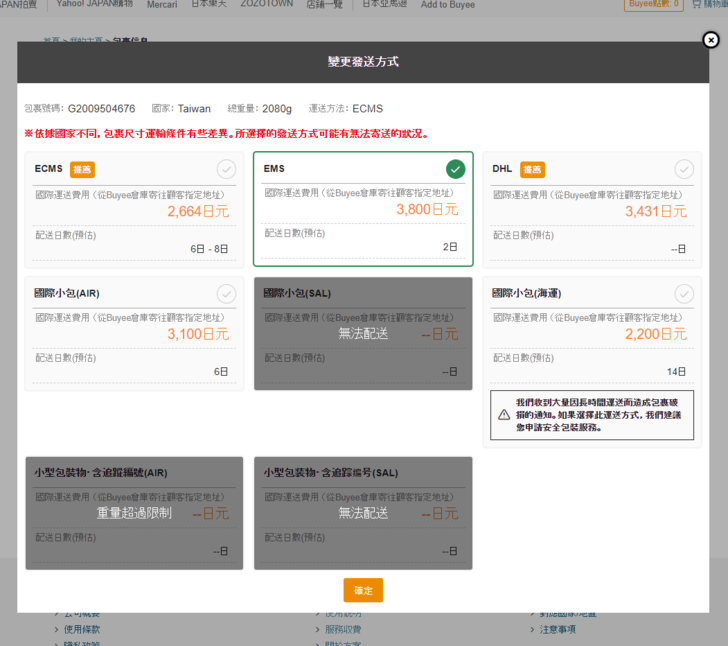 ▼因為剛好Buyee有推出限時活動,國際運費免運,小編當然給他選擇最快最貴的EMS啦!!
