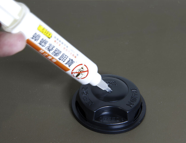 ▲將蟑螂凝膠餌寶®對準飼盒的注藥孔,將藥劑注入約 1~2公克,在注藥完畢後,記得要將推桿往後抽 1-2mm 避免垂流