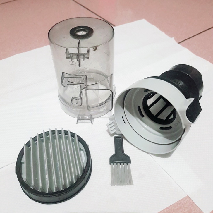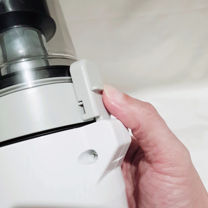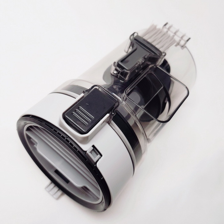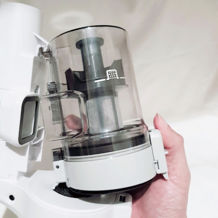 ▼ 集塵盒的按鈕按下,就可以取下集塵盒。(正常要向下拆缷,因為現在是乾淨狀態。)