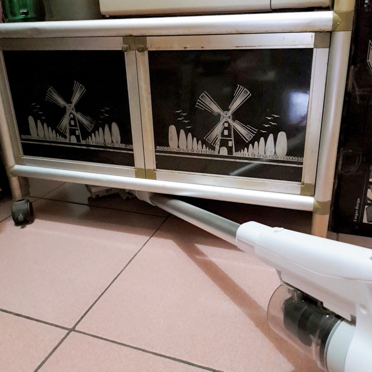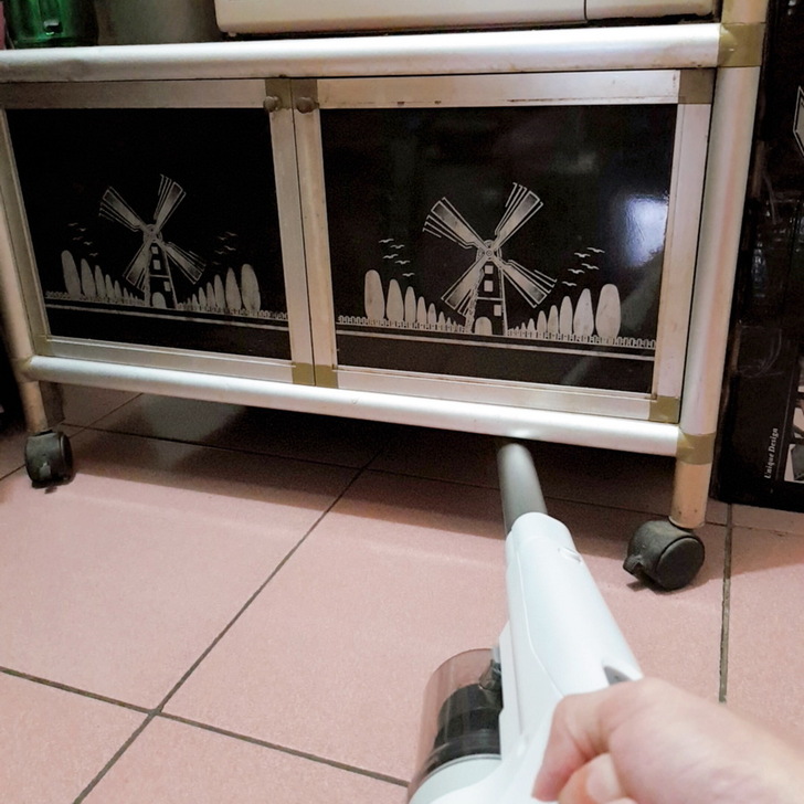 ▼ 家中置物櫃下方,以往都要用掃把或拖把慢慢掃,也很難知道到底有沒有掃乾淨。