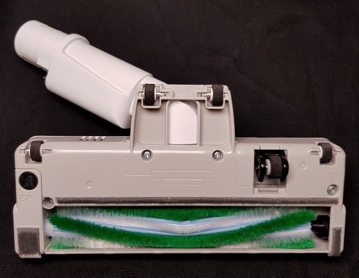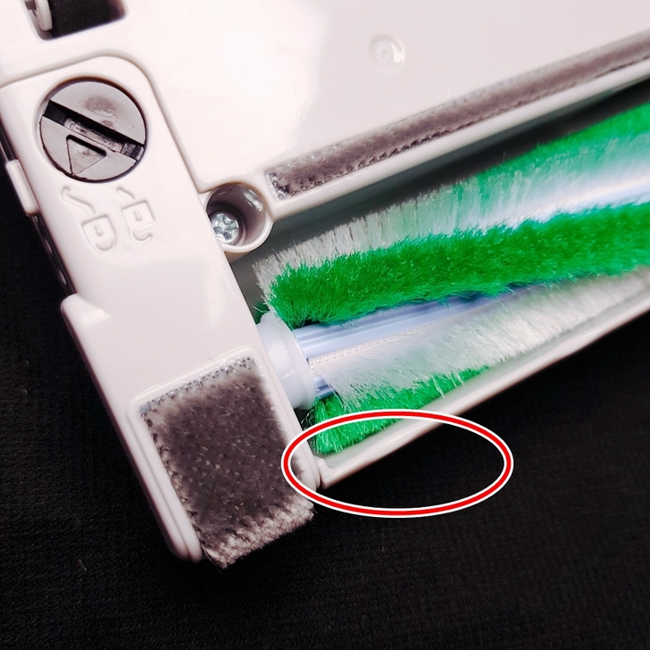 ▼ 底部可以看到獨特的二合一V型刷毛,綠色刷毛較軟,適合用於木質地板、白色刷毛較硬,可以刮起地毯底層的塵蟎屍體及糞便。都不用更換吸頭,能一次清掃到底。