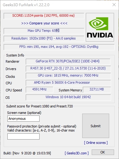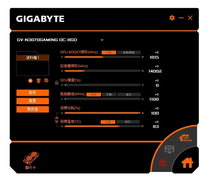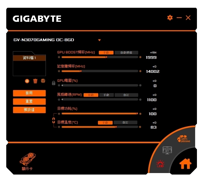 GAMING RTX 3070 OC 預設時脈 1750Hz 加速 1815
