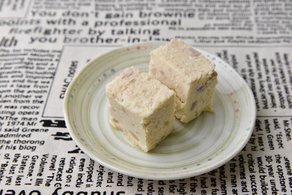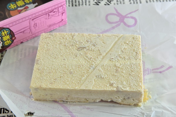 打開之後就是芋頭乳酪蛋糕本人了,可以看到蛋糕中間有一些芋頭的顆粒,