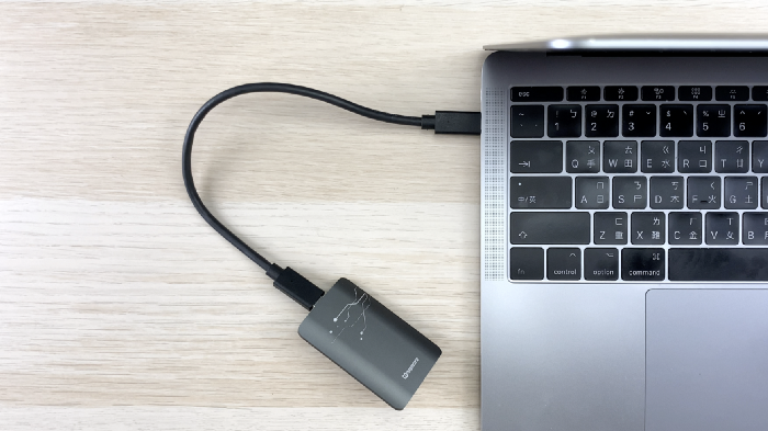 透過隨附的 USB-C cable 連接到 MacBook Pro。