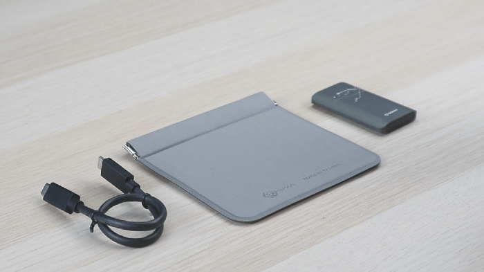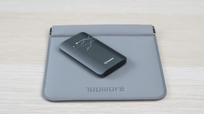 雖然同樣在購買頁面上,已經看過廣告說這個收納袋的優點。實際拿到收納袋的質感,還真的比預期還好,也比常見的贈品收納袋有質感。正面有 TOPMORE 的 Logo,淺灰色也不容易沾髒顯污,表面材質非常親膚,還是防水材質。空間也相當大,同時放下 TS1 SSD、C to C 傳輸線,還有空間放手機充電線呢!