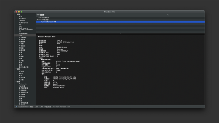從 Mac 中可以讀到其晶片為 VIA VL715,這是一顆 USB3.2 Gen2 10Gbps to SATA 6Gbps 的轉接器,因此推敲裡面應該是 mSATA 的 SSD,在與客服確認後也證實此一想法。連接上電腦時,預設為 NTFS 的檔案系統格式,為了方便各種裝置讀取,等下先把他格式化成 exFAT。