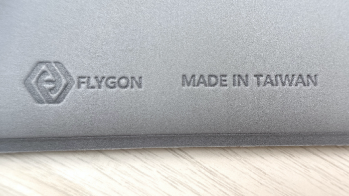 在收納袋背面底部有 FLYGON Logo 以及 Made in Taiwan 的鋼印。後來查了一下發現 Flygon 是一家做這種材質收納袋的公司。