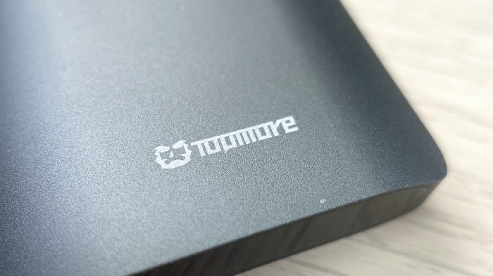 表面處理不會太粗,但拿在手上仍有不錯的摩擦力。正反面的文字和圖案都是雷射上去的,因此不會掉漆。正面是 TOPMORE 的 Logo,背面則有 1TB 和 PORTABLE SSD TS1 的字樣。