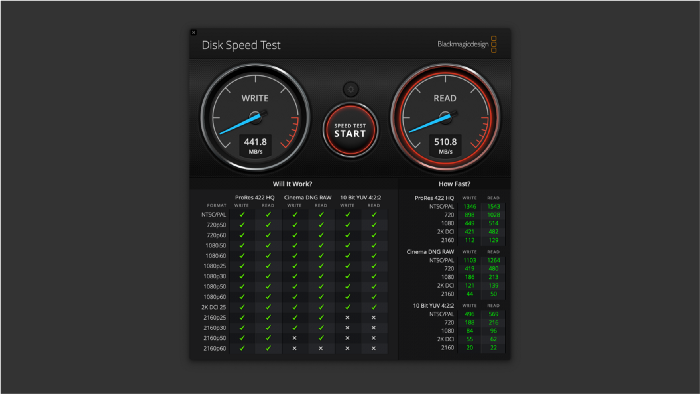 以 Blackmagic Disk Speed Test,設定檔案大小 5GB,寫入約在 440MB/s,讀取則突破 500MB/s,且連續測試幾次,都穩定在 500MB/s 以上。