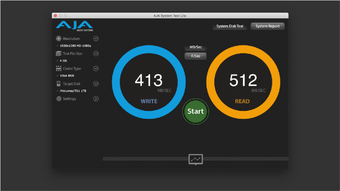 以 AJA System Test 測速,寫入在 400~420MB/s 左右,讀取則都在 500MB/s 以上。