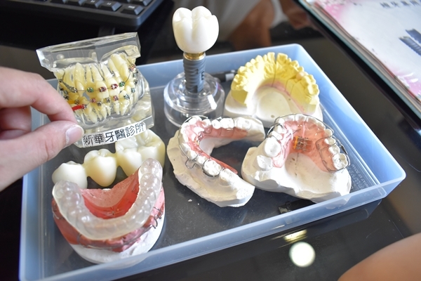桌上陳列者許多牙模。護理師先幫我介紹植牙的部分,之後才講解今天的美牙SPA噴砂