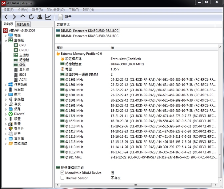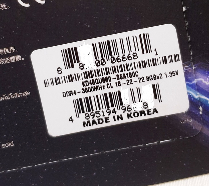 速度/延遲時序/運行電壓:3600MHz、CL 18-22-22-42 @ 1.35V