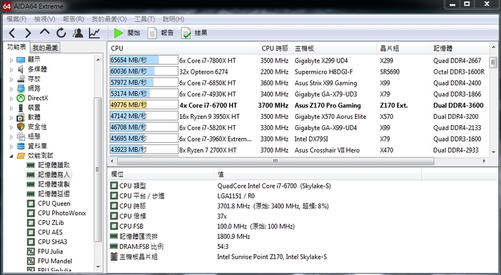 ▼ 使用 AIDA64 記憶體效能測試,讀取、寫入、複製 測試結果。