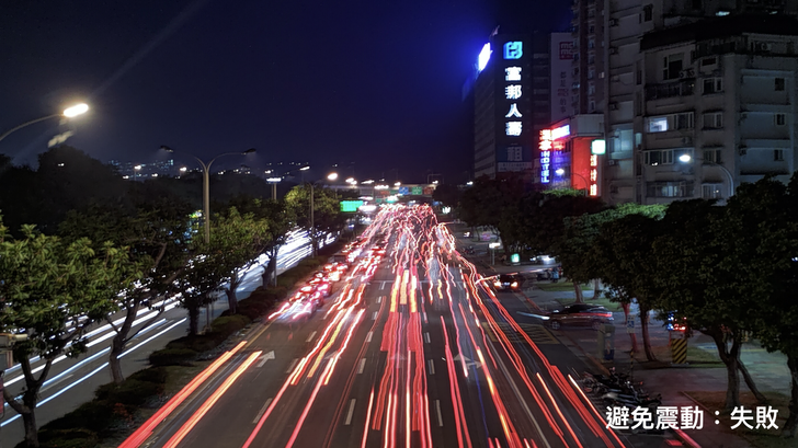 如果震動問題沒有被控制好,拍攝後就會發現,光軌有扭曲或波浪狀。若像我們這次在行人天橋拍攝,便容易受到大卡車經過、其他行人路過天橋、強風……等,造成的晃動所干擾,因此選址、場勘的重要性尤為重要。