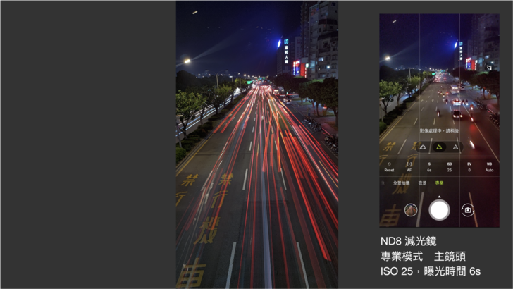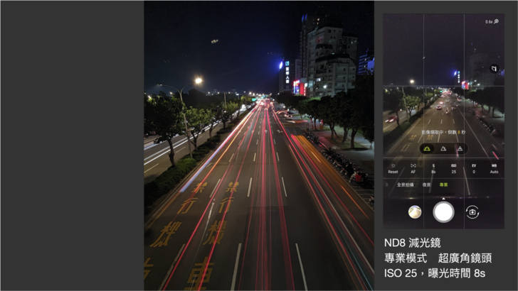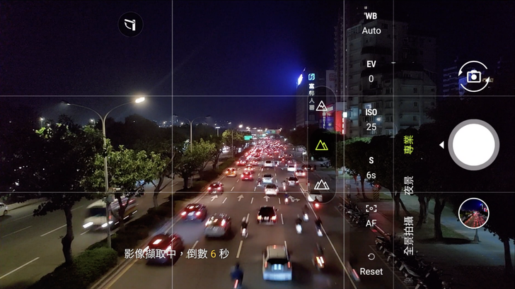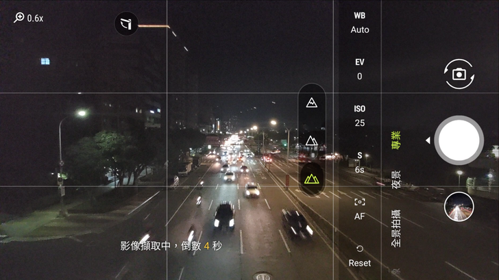 這次以 ZenFone 7 內建的拍照應用程式做示範。在專業模式中設定:主鏡頭,ISO 25,曝光時間 S 6 秒。快門按下後,畫面會顯示「影像擷取中,倒數 X 秒」。