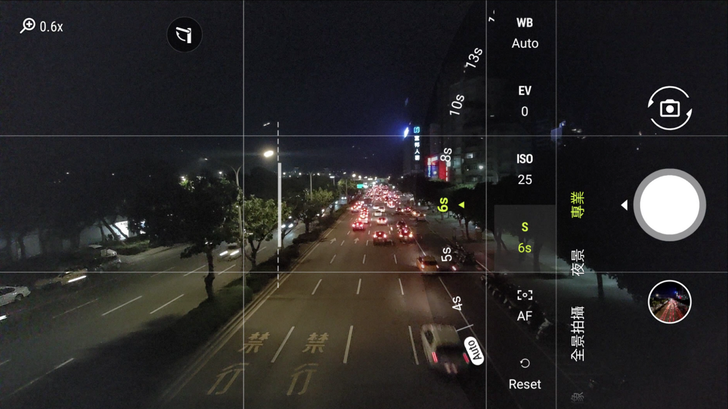 上面提到的曝光時間約 4~6 秒,實際仍依你選的場景、手機、ISO、減光鏡……等影響。因此建議多拍幾次,嘗試不同曝光時間。例如覺得 6 秒剛剛好,可以額外嘗試 4~8 秒的曝光效果。而 ZenFone 相機中的專業模式,在 ISO 和曝光時間 S 時,會以大轉盤的方式讓使用者快速看到選項,是我覺得操作中非常順手的設計。