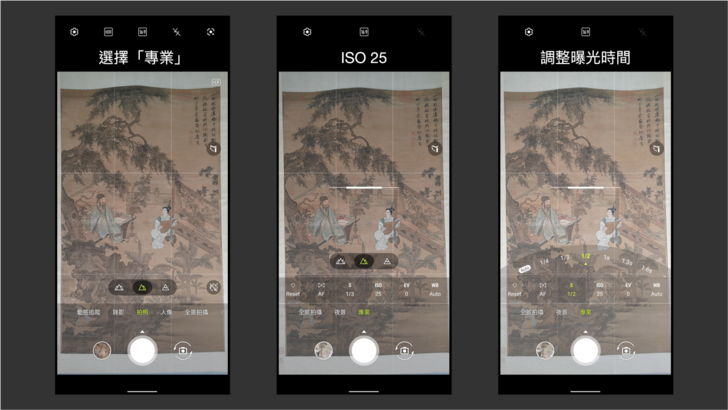 以書畫類的展櫃來說,我會優先在 1~1.6 秒之間嘗試。曝光時間過短畫面就會太暗,曝光時間也不宜過長,以免發生過曝失去細節。實際仍依展間光源、展品反光特性判斷。例如器物類的展區,櫥窗燈光比較充足,同樣 ISO 25 的情況下,曝光時間便可相應減少。曝光時間通常不需超過 1/2 秒,大多在 1/3~1/10 秒之間即可。