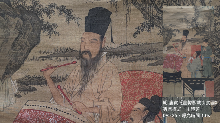 第三幅是「明 唐寅《畫韓熙載夜宴圖」。以 ZenFone 7 專業模式,超廣角鏡頭拍攝。ISO 25,曝光時間 1.6 秒。此幅作者唐寅,便是大家熟知的唐伯虎。