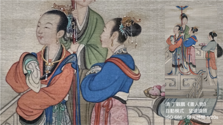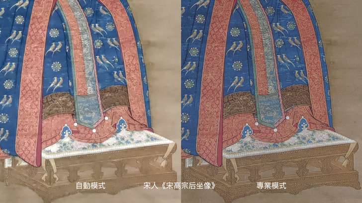 將自動模式與專業模式的拍攝左右陳列對比,因為此張畫作拍攝較暗,後製同時增加相同參數的曝光,以方便讀者瀏覽比較。專業模式中,几案下的圖案清晰可見,人物衣服上的紋理較明顯,人物五官輪廓也較為清晰,而自動模式幾乎無法看清。