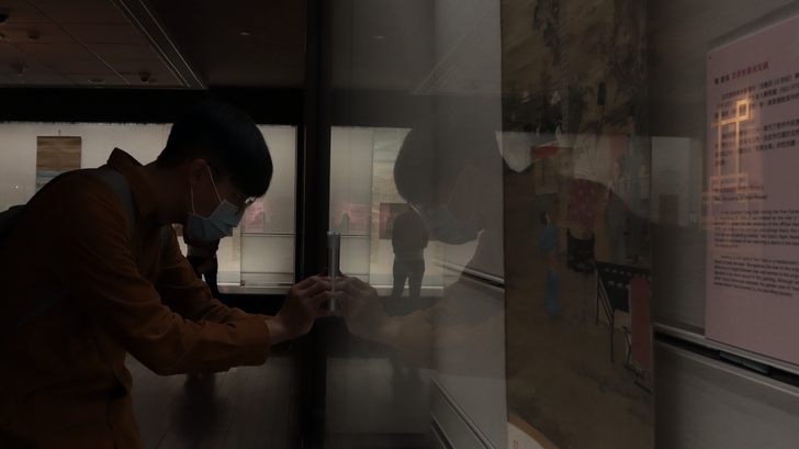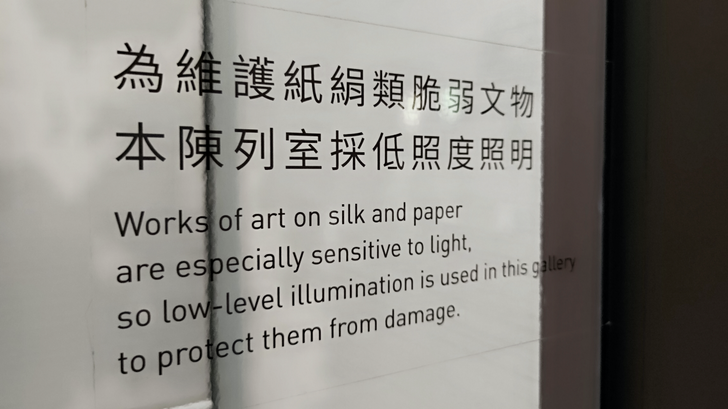 在展間中也會看到中、英文的提醒「為維護紙絹類脆弱文物,本陳列室採低照度照明。」也請大家遵守故宮規定,不要使用閃光燈、補光燈、腳架、穩定器。