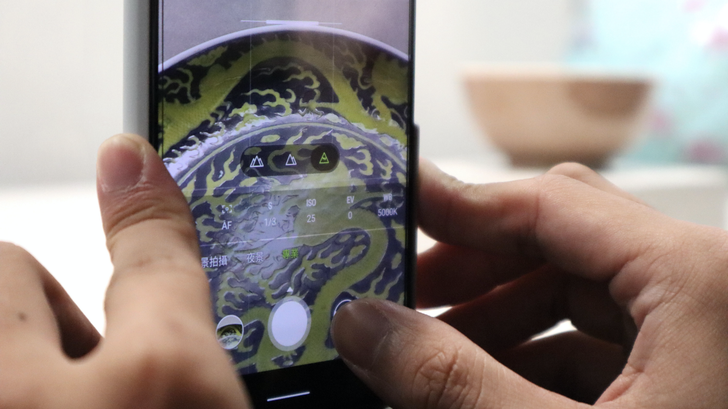 在書畫這類平面的文物上,構圖和對焦尤為單純。抓一下邊框範圍,點一下畫面,就可以自動對焦完成。但如果是瓷器、茶碗、陶碗……等立體器物,則需要多考慮一下要聚焦的前後景關係,再利用自動對焦來確定畫面呈現。