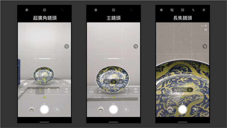 ZenFone 7 的三鏡頭焦距分別為:超廣角鏡頭 14.3cm、主鏡頭 26.6cm 和長焦鏡頭 80cm。故宮北院的展櫃幾乎都可以使用超廣角鏡頭 14.3cm 和主鏡頭 26.6cm。有些展櫃不深,展品與手機之間的距離太短,若使用長焦鏡頭 80cm 便會發生對焦模糊的情況。選擇合適焦距的鏡頭,可以記錄下不同尺寸的文物。