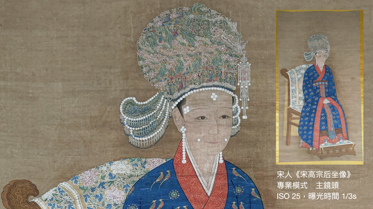 第六幅是「宋人《宋高宗后坐像》」。以 ZenFone 7 專業模式,主鏡頭拍攝。ISO 25,曝光時間 1/3 秒。這幅展品非常大,高 189.4cm,寬 104cm。