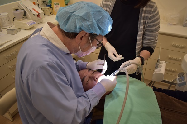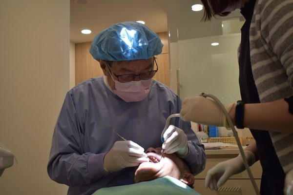 新銳牙醫師劉有恆的任務就是將有顏色的部分清掉,上下顎洗牙的清理所需時間會落在十分鐘左右,很快的。