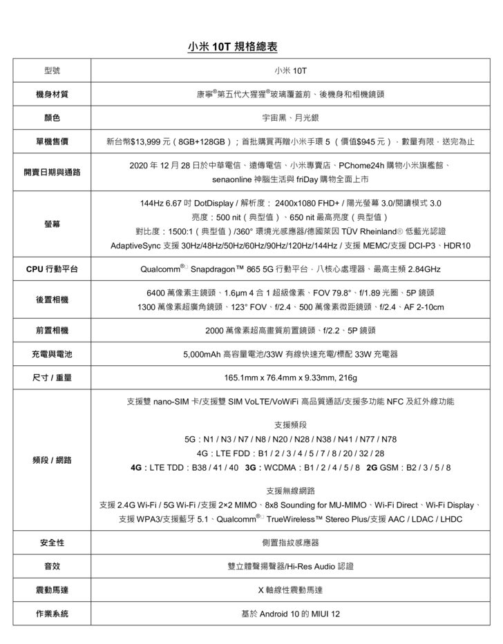 小米10T配備6.67吋144Hz AdaptiveSync變速高更新率螢幕、Qualcomm® Snapdragon™ 865旗艦5G行動平台,搭載6400萬像素AI三鏡頭及5,000mAh 超大電量等高規格5G行動體驗;小米10T提供宇宙黑與月光銀共兩種顏色,售價為新台幣13,999元(8GB + 128GB),自12月28日起在中華電信、遠傳電信、小米專賣店、PChome24h購物小米旗艦館、senaonline神腦生活與friDay購物全面上市;首波購買再贈送小米手環5,價值新台幣$945元,換新手機配新手環迎接嶄新的一年;數量有限,送完為止。