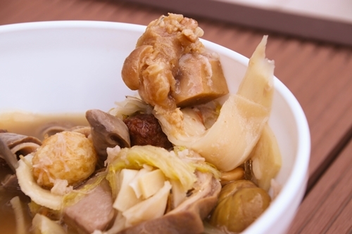 豬腳、鳥蛋、豬肚、栗子、筍片、芋頭等等