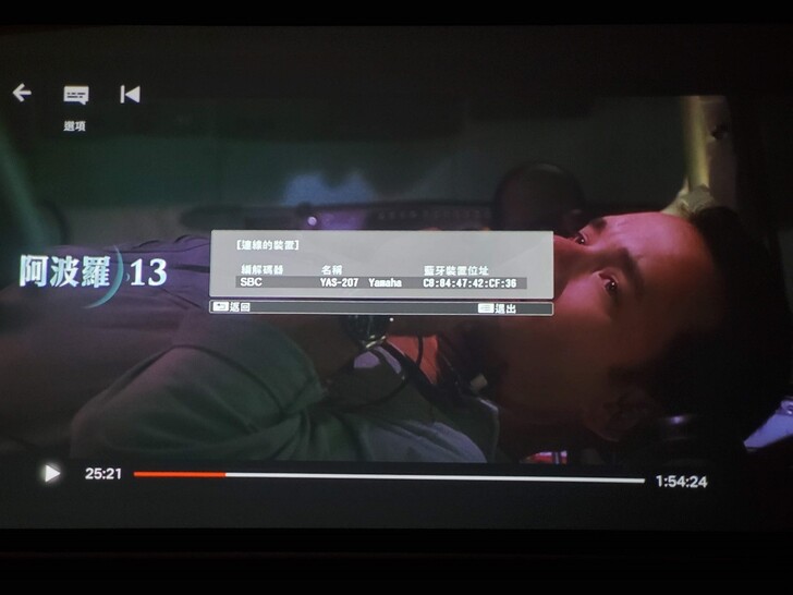 這個就很實用了,對於不是很追求高標準的音響效果來說,使用藍芽喇叭來替代內建的喇叭,或是藍芽耳機(家裡有小朋友的爸比應該知道鍾把拔在說啥),測試使用家裡的YAMAHA YAS-207配對後,即可正常透過YAS-207發出音訊,延遲效果也還好,幾乎沒有延遲。