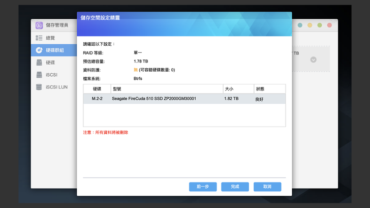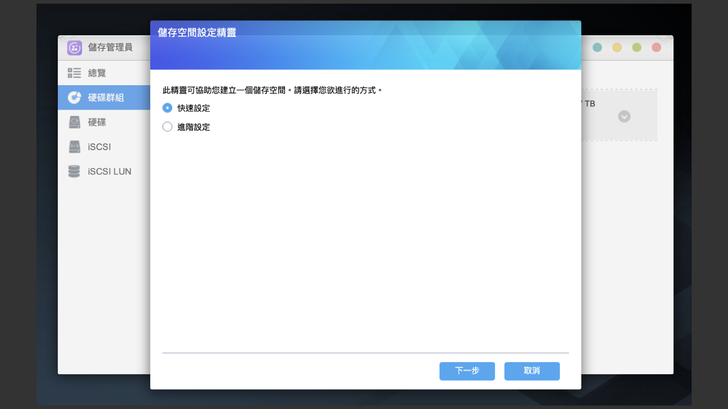 再次進入已經是最新版的 ADM3.5.2。在「儲存管理員」》「硬碟群組」,的確可以將 M.2 SSD 作為獨立儲存池,這次選擇快速設定,按「下一步」。