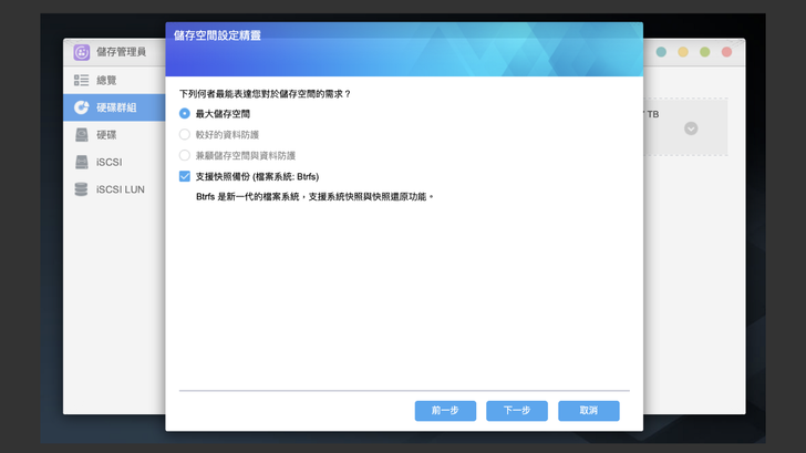 選擇作為最大儲存空間,這次先試試看 Btrfs,之後實際使用預計是不會用 Btrfs,因為已經用 HDD 做備份,SSD 理想上是為了做短時讀取使用。