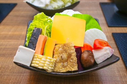 季節時蔬組成的新鮮菜盤,這菜盤份量不算少,也有發現到幾乎沒加工火鍋料,然後我湯底是點北海道起司牛奶湯,所以有多附上一片起司,等著湯底上桌就能丟入!